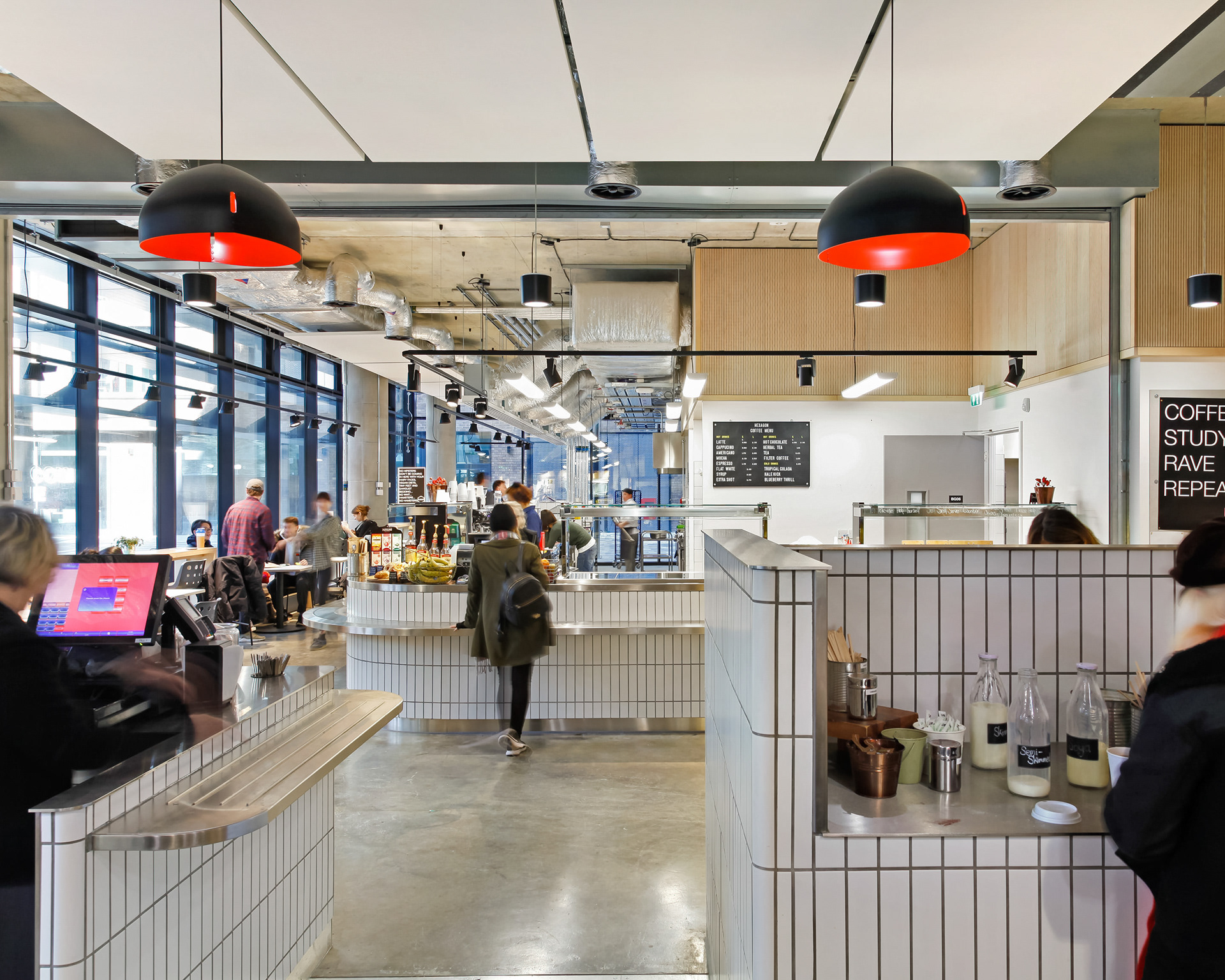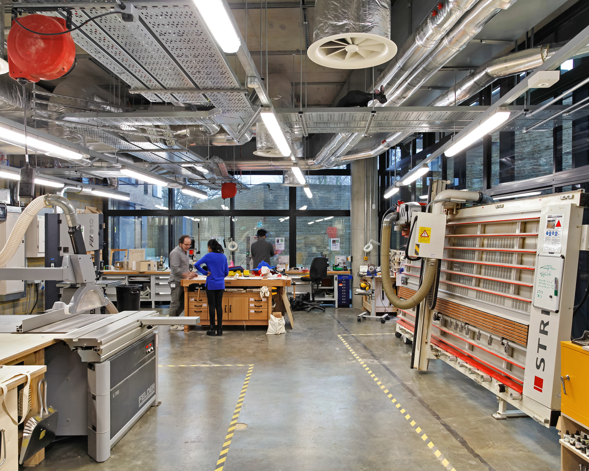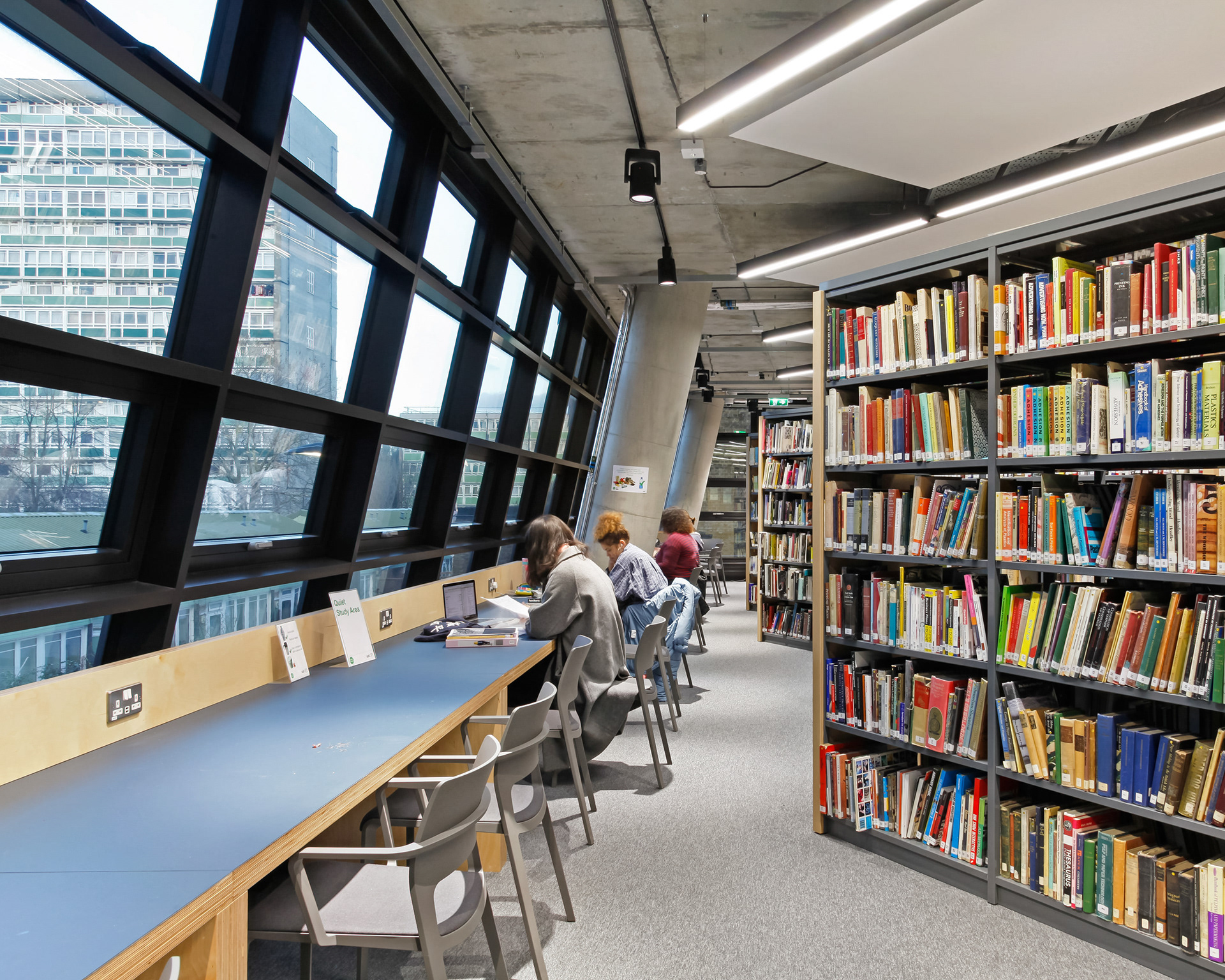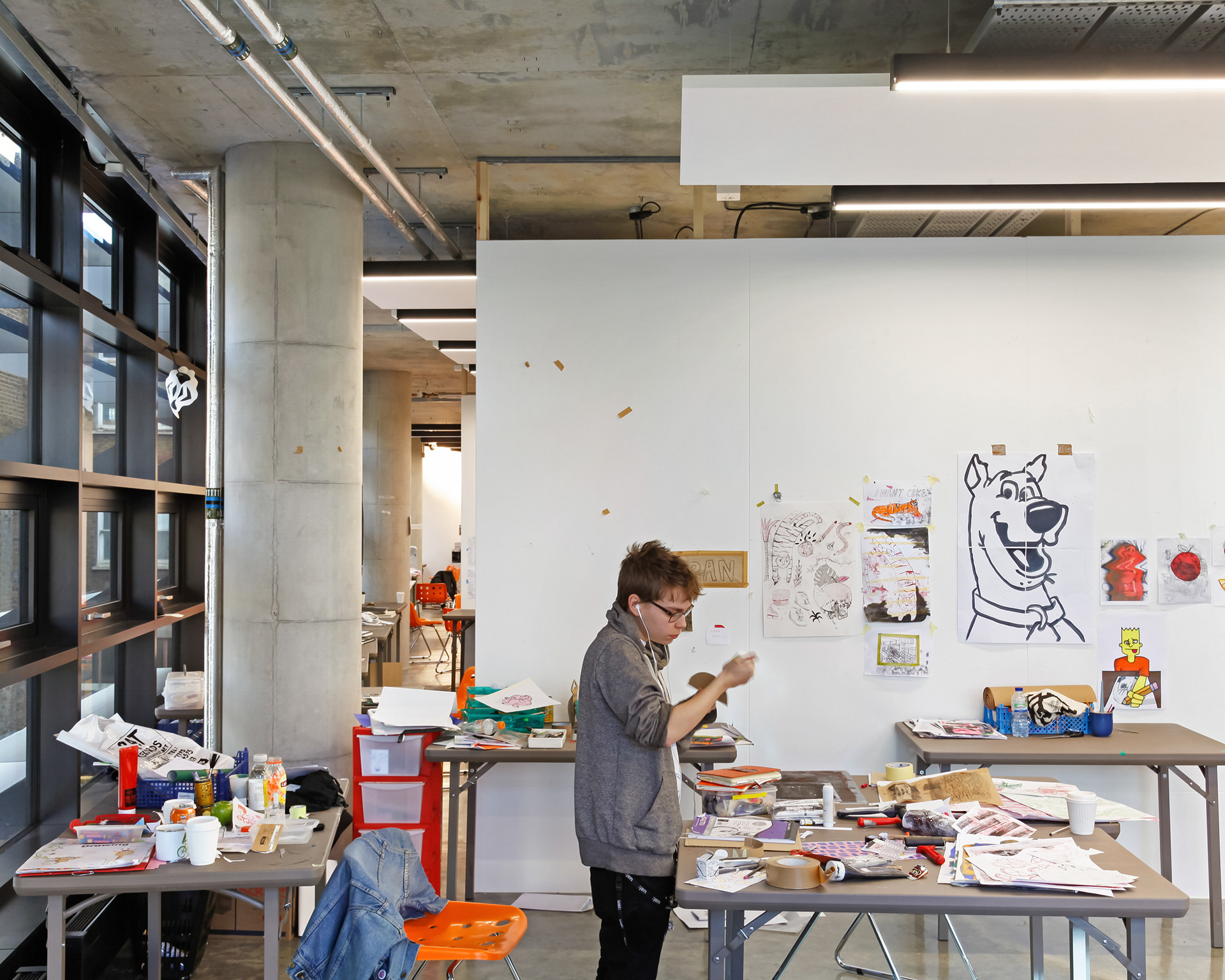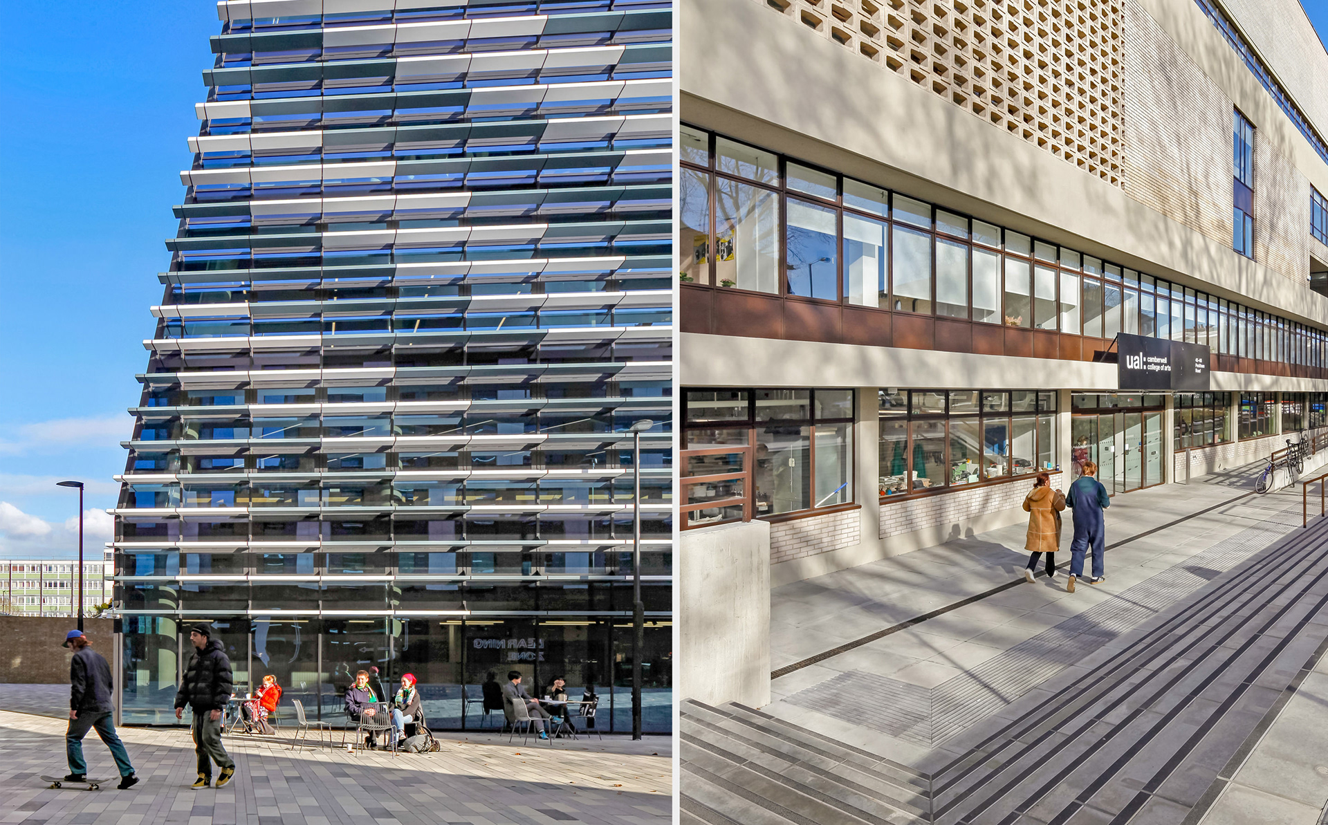 The scheme involves new student accommodation and a studio building formed over six floors with louver cladding for good daylight. A new entrance by ramp to the lower ground floor and campus courtyard.