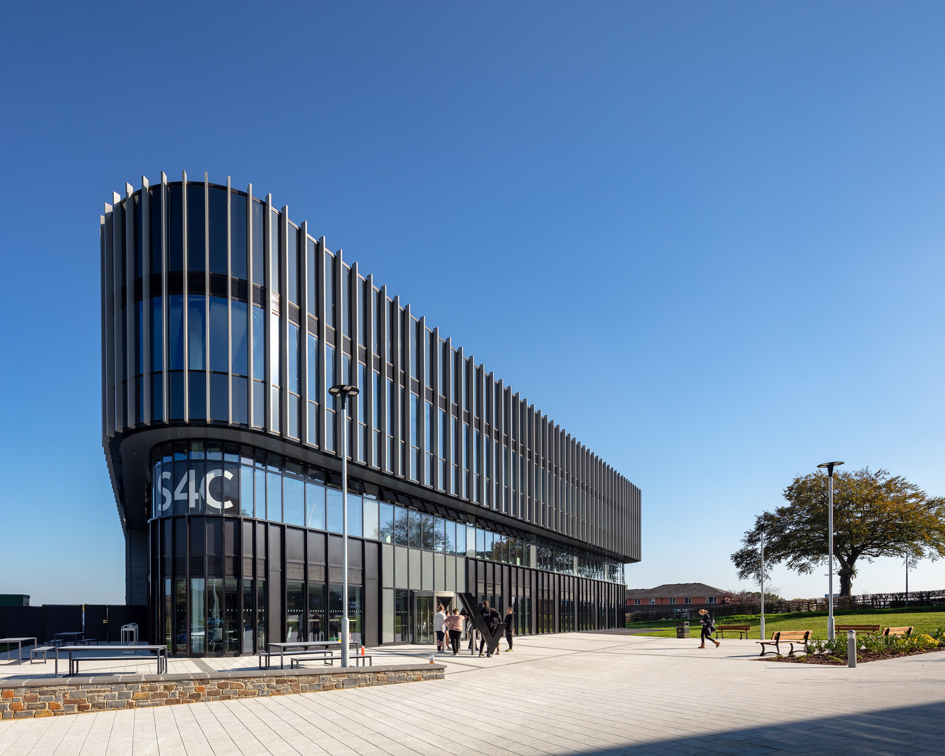 Canolfan S4C Yr Egin has a contemporary and exciting vision to bring together creative, digital and cultural practitioners within the same building, to exchange information, to innovate and to create jobs. Located on the Carmarthen Campus of University of Wales Trinity St David (UWTSD), the building’s design was founded on the close relationship between the University, would-be tenants of the centre and the wider Welsh-speaking community. This relationship, or trinity, is reflected in the simple triangular form that grows from Carmarthenshire’s soil; a titular reference to ‘Yr Egin’ - a Welsh play on words referencing energy and birth. The building is linked to the main campus by a large public square that allows for the staging of a variety of outdoor activities.