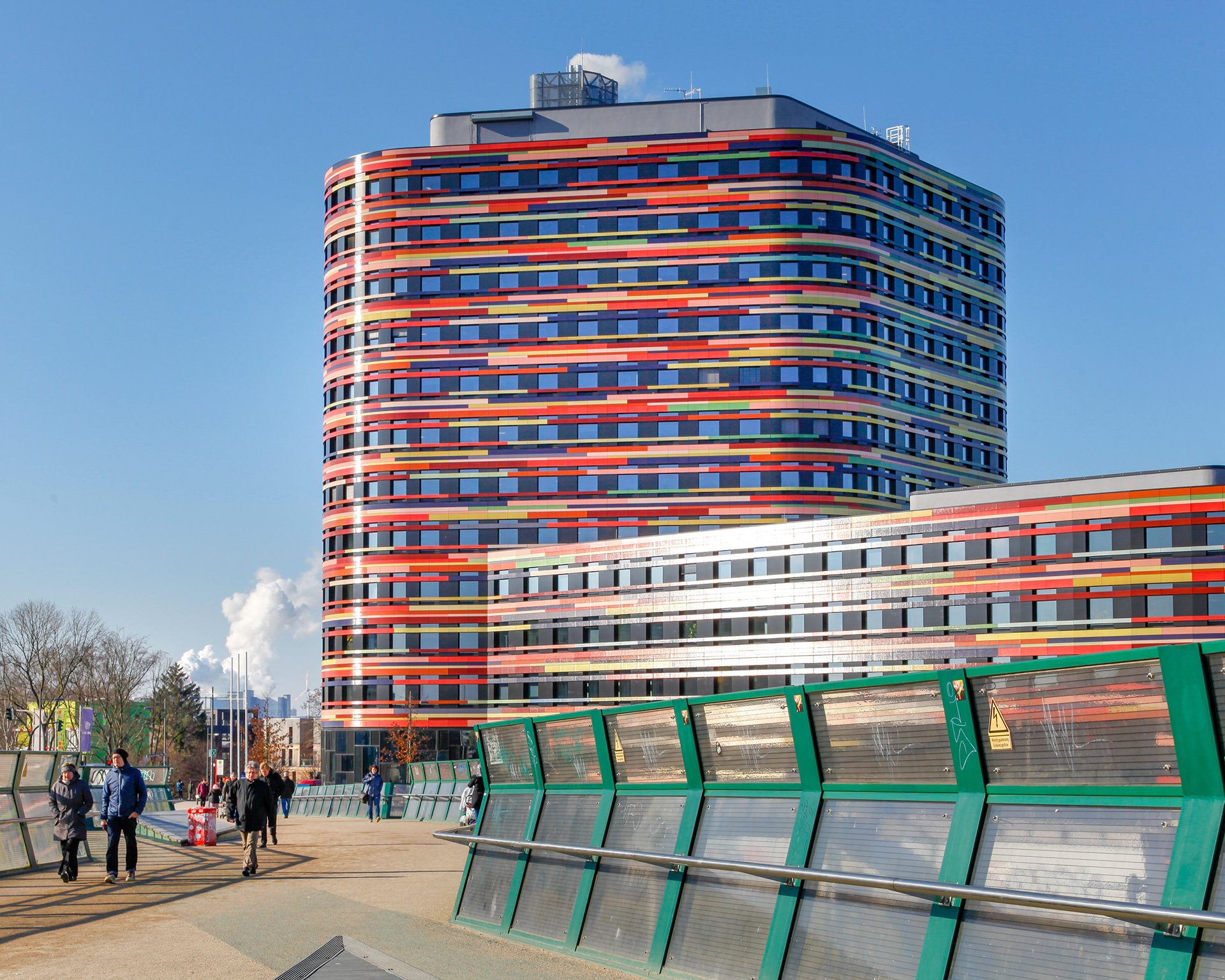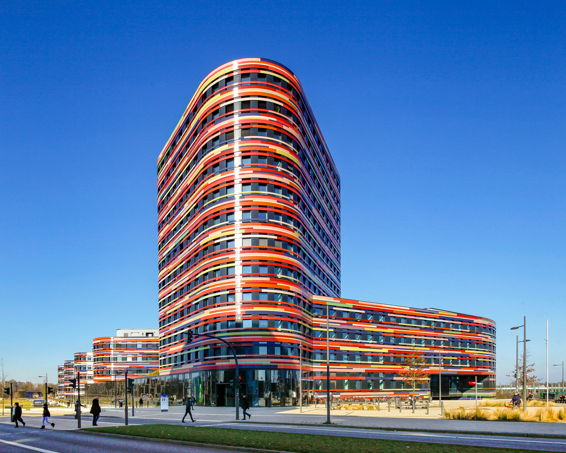Office building for the Behörde für Stadtentwicklung und Wohnen, Wilhelmsburg, Hamburg. This building is the flagship of Hamburg's International Building Exhibition (IBA) 2013. In order to reduce energy consumption the building uses enhanced thermal insulation, and appropriate level of facade transparency, compact building volume and natural cross ventilation. All heating and cooling is achieved via geothermal energy, electricity is produced by a local gas powered combined heat and power unit supplying the district. The building runs on less than 70kWh/sqm/year.