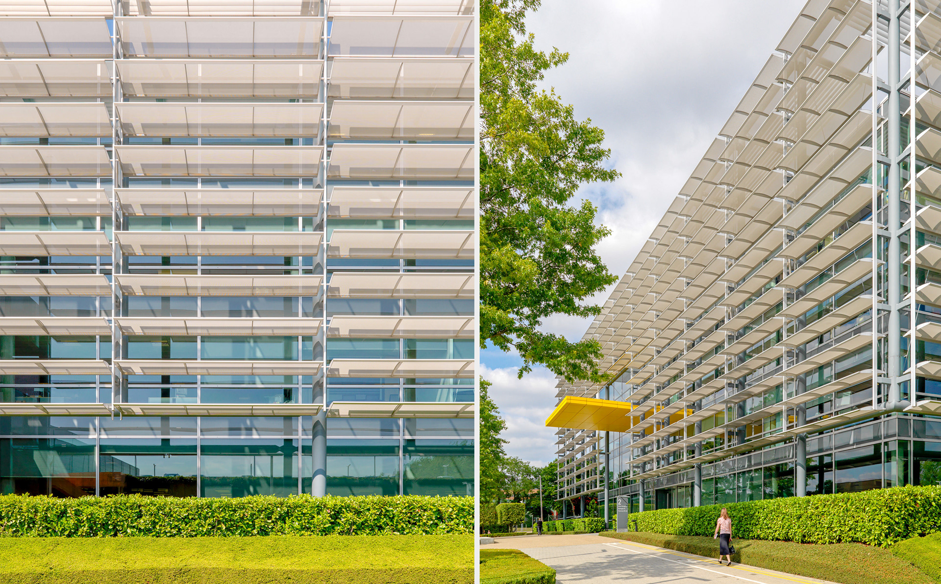 Six four-storey buildings open onto a formal boulevard, with a leisure club, cafe and other centralised facilities surrounded by generous informal landscaping. Each building is oriented north/south, with mechanically activated brise soleil protecting the west, south and east elevations. These arrays of &'translucent' perforated aluminium louvres are controlled by the building management systems that track the sun's path. Views from fully glazed facades are achieved throughout, with controlled protection from direct sunlight, yet because of the layered facades occupants enjoy considerable privacy.
