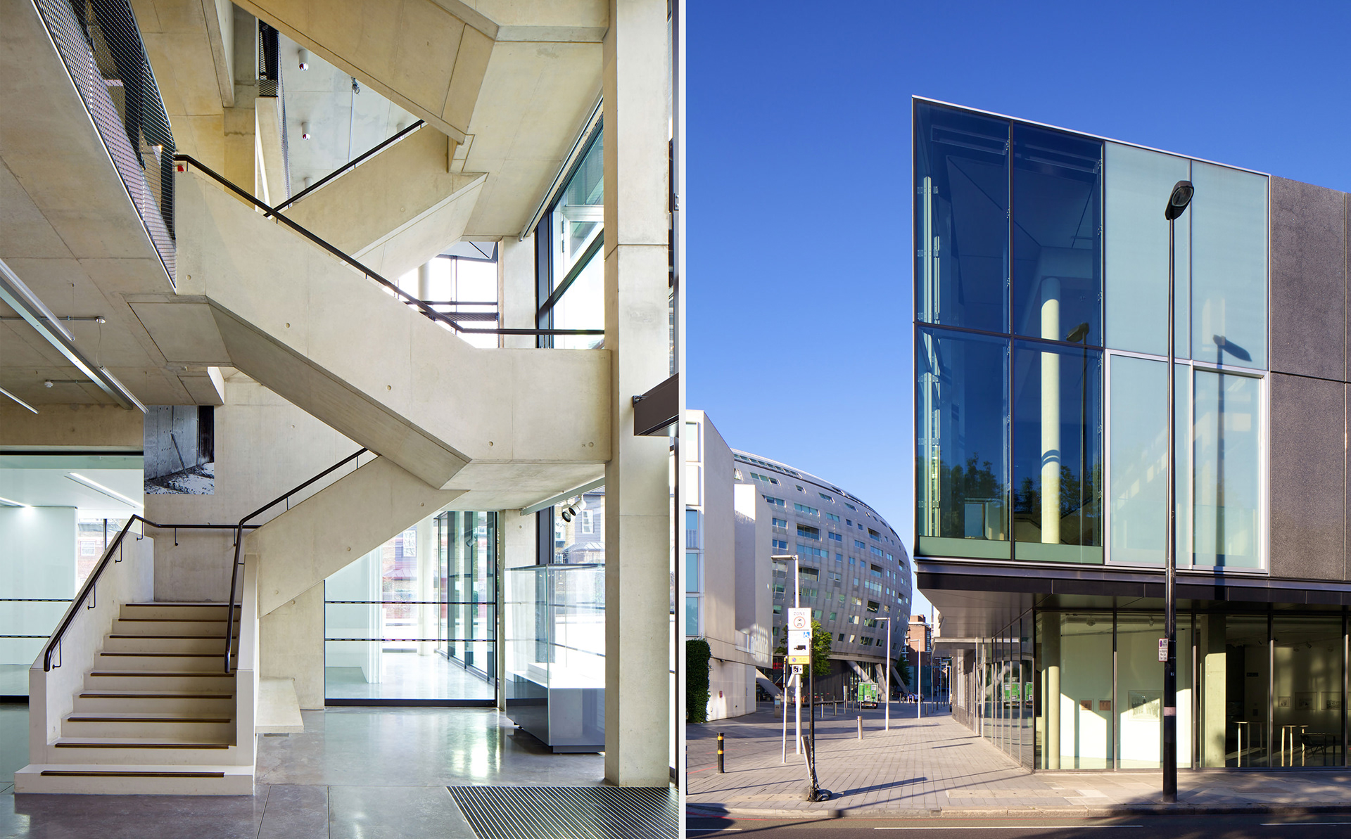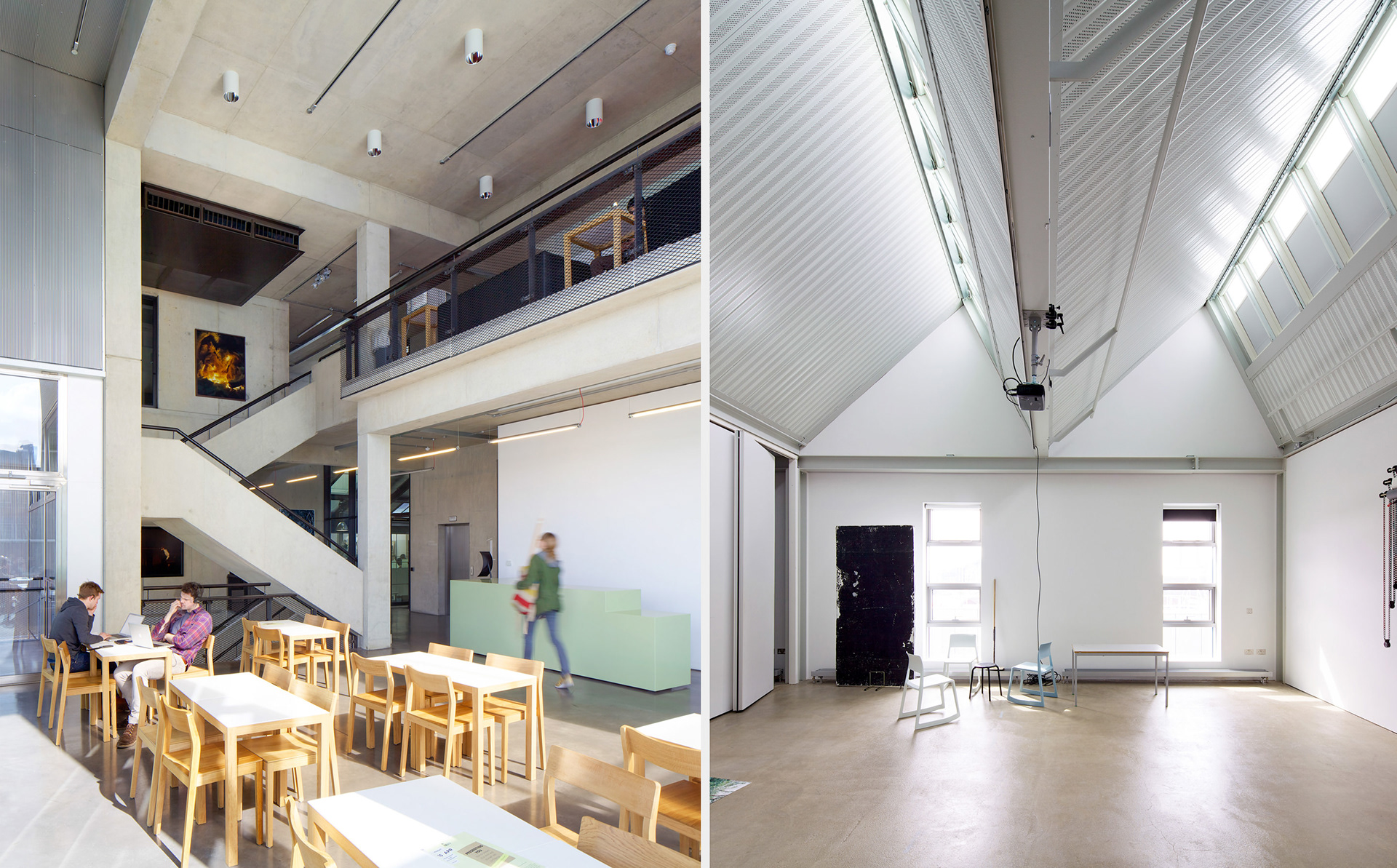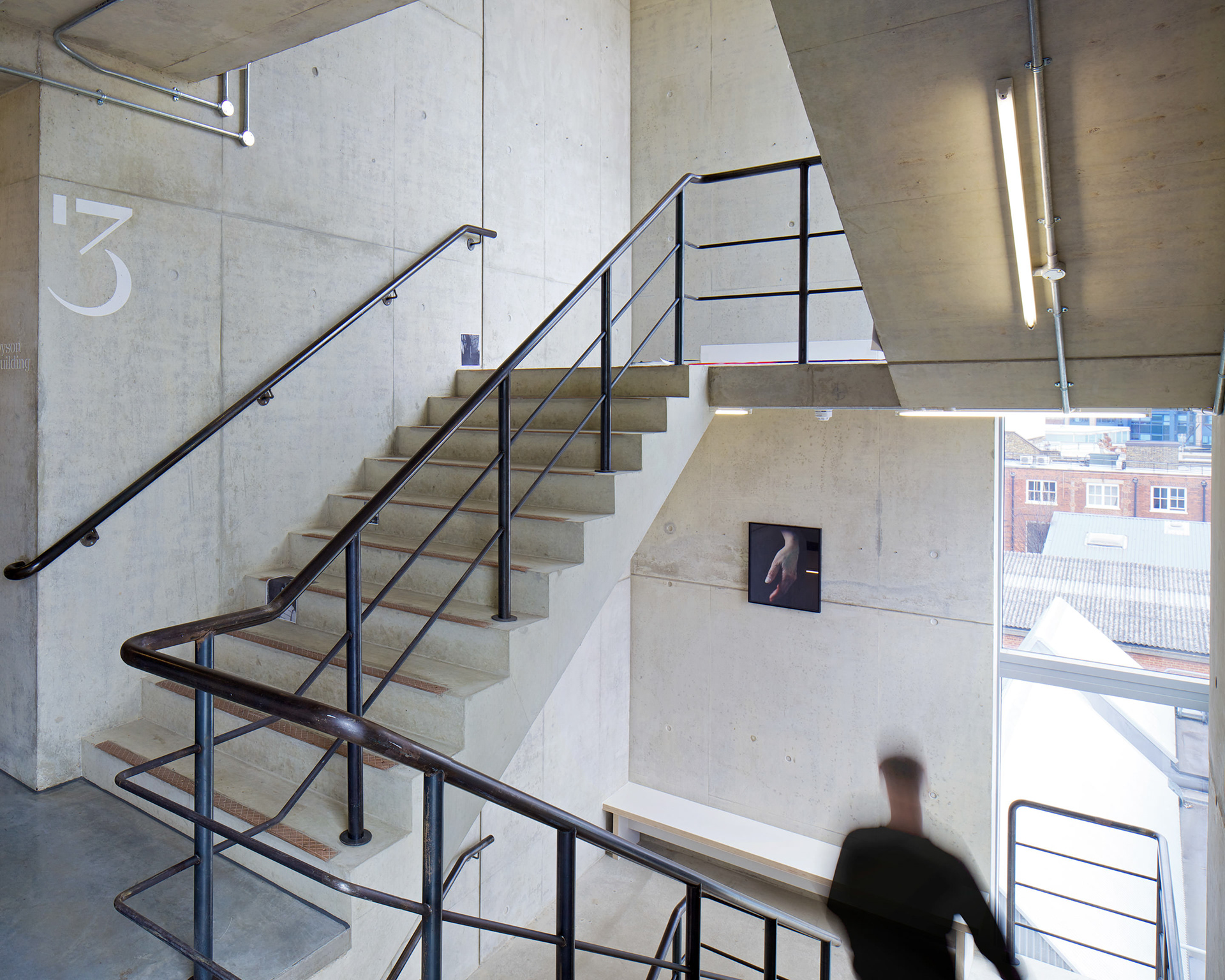 The building is conceived as a creative 'factory' both in the industrial sense (as a place of industry), and through the reference to Andy Warhol's 'Factory' as a place of art production. The building's aesthetic is functional and derives from the way it has been made - an in-situ concrete structure, exposed throughout and used expressively to form a series of dramatic interlocking spaces. The cross-fertilisation of ideas that is present and encouraged on the courses also is enhanced through the additional inclusion of start-up incubator units for new businesses within the main building, blurring the boundary between the academic and the commercial.