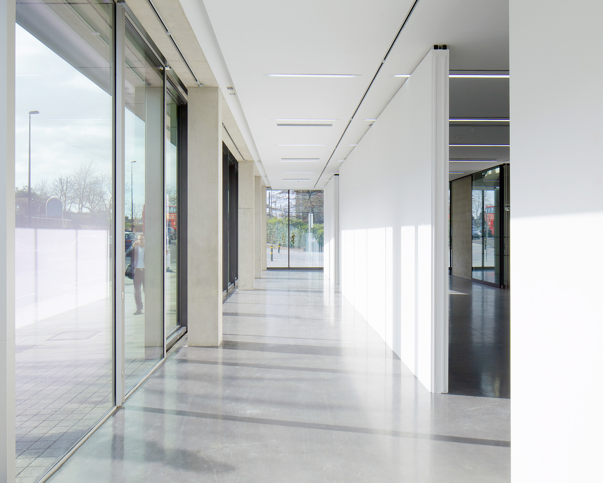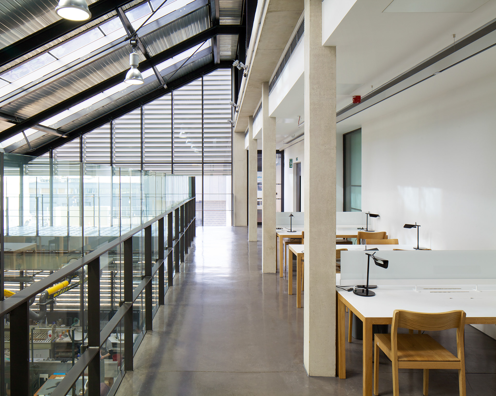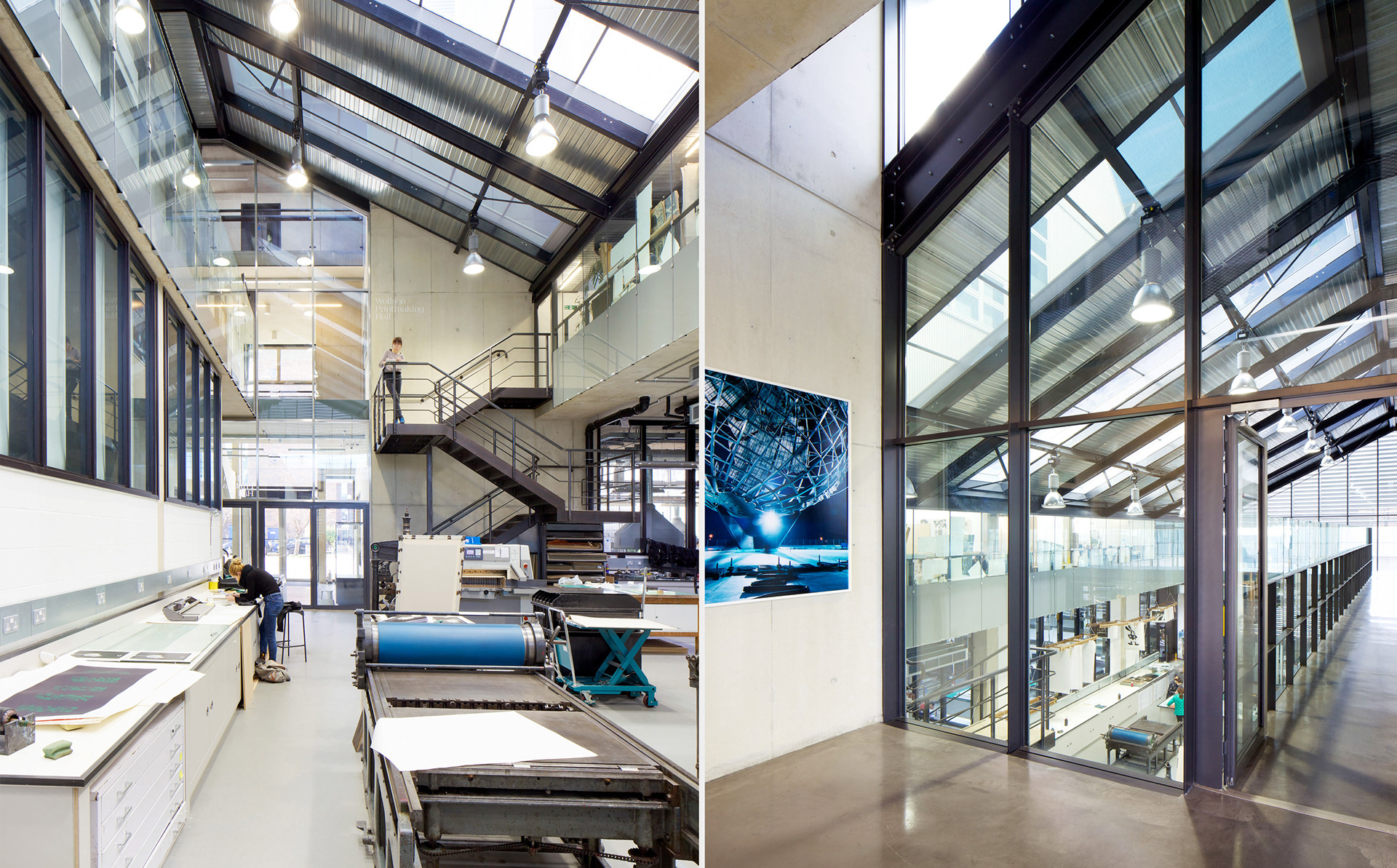 The building is conceived as a creative 'factory' both in the industrial sense (as a place of industry), and through the reference to Andy Warhol's 'Factory' as a place of art production. The building's aesthetic is functional and derives from the way it has been made - an in-situ concrete structure, exposed throughout and used expressively to form a series of dramatic interlocking spaces. The cross-fertilisation of ideas that is present and encouraged on the courses also is enhanced through the additional inclusion of start-up incubator units for new businesses within the main building, blurring the boundary between the academic and the commercial.