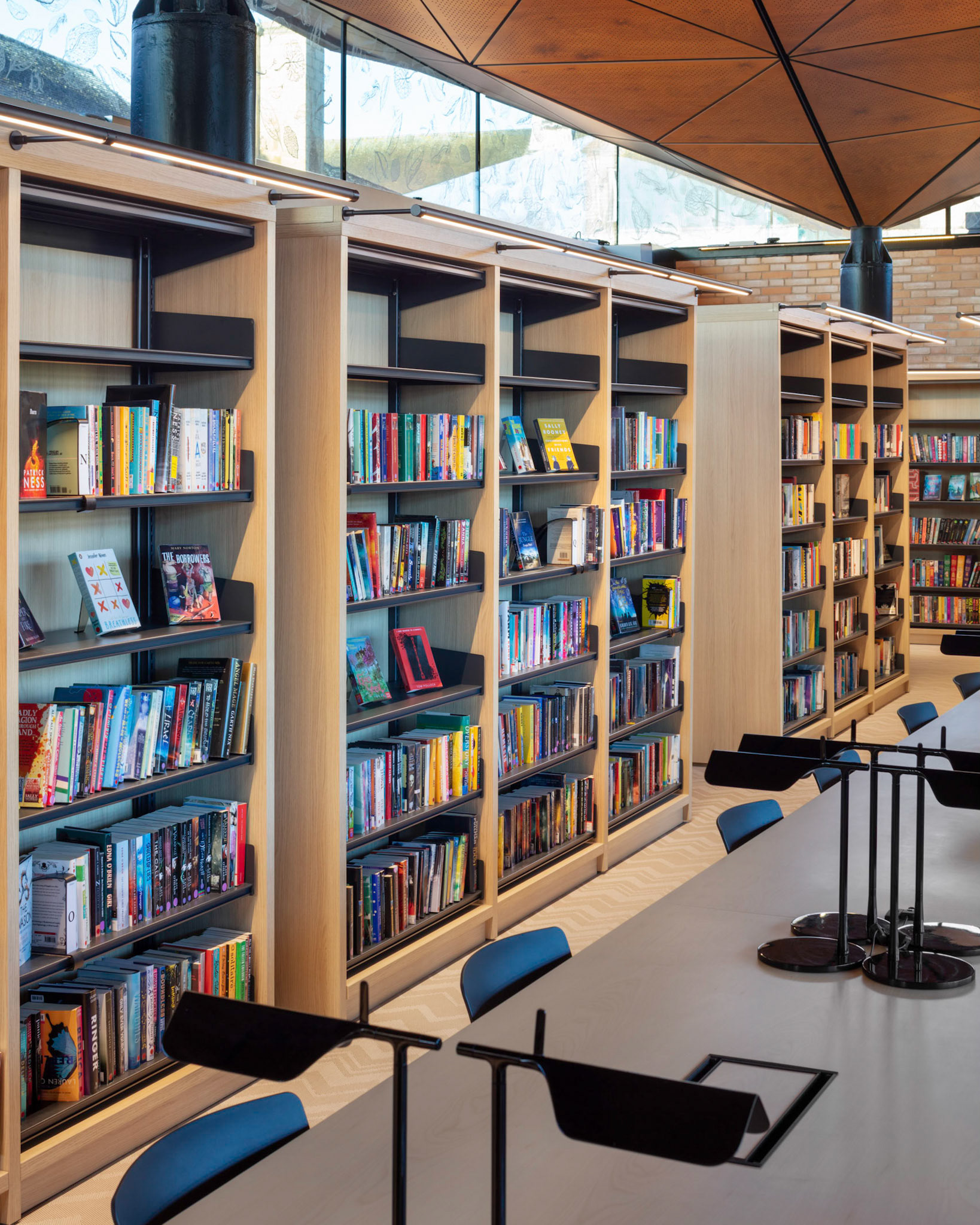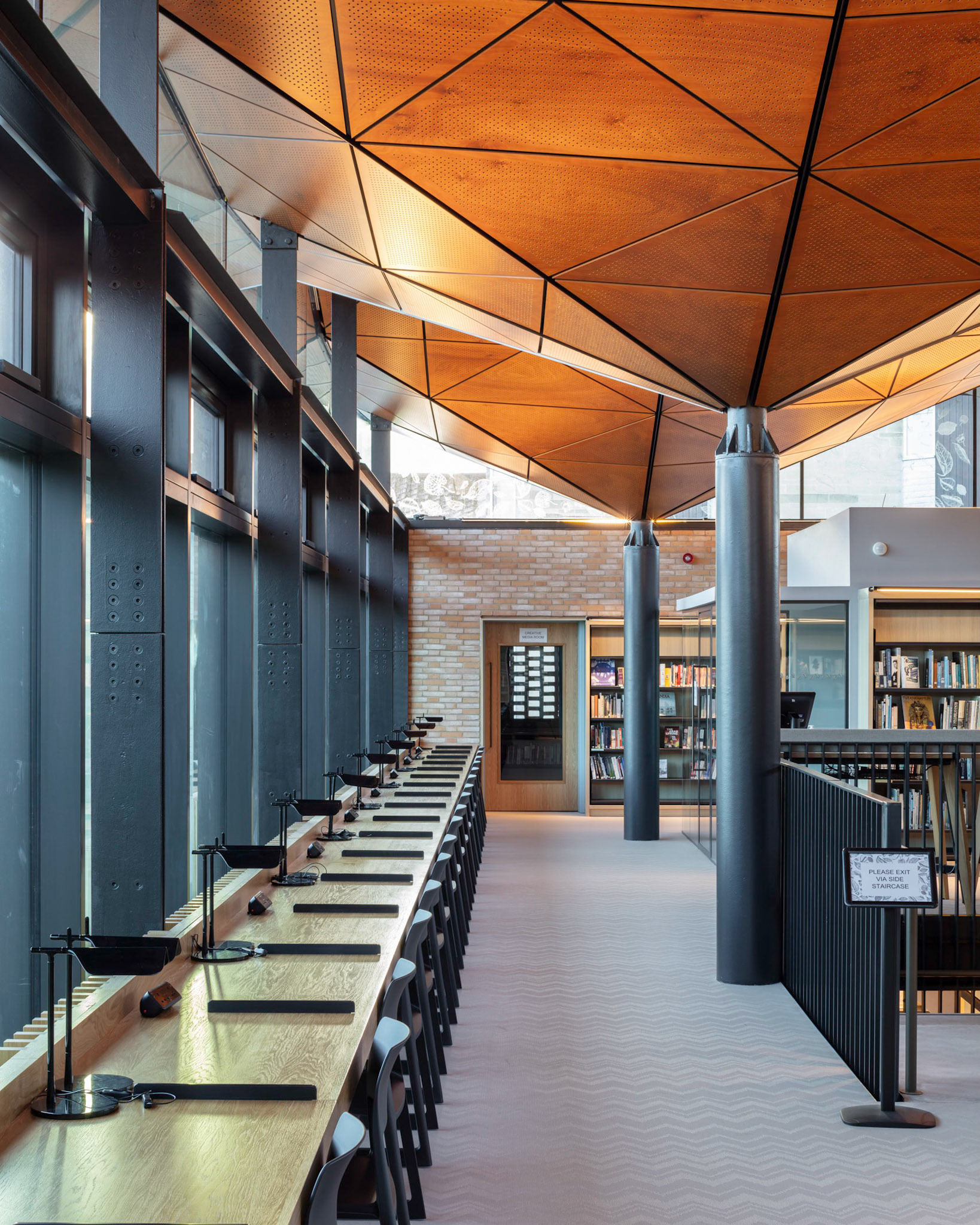 The architects, Woods Bagot, designed the building to resemble a forest with the core columns reaching upwards and spreading out towards roof level to indicate branches. Combined with a high level clerestory window system which wraps fully around the building this creates a cantilevered roof that is finished on the underside with a specialist timber soffit system encapsulating a seamless internal and external finish. Built by Beard Construction, the new library sits at the heart of the school and provides a hub of learning excellence for students and staff. Whilst both levels offer large open plan spaces, the ground floor features soft seating, an interactive coffee table and flexible teaching zones. The stairwell has been designed to create a natural set of amphitheatre steps for presentations and there is direct access to the outside terrace and orchard. The upper floor provides a more formal library atmosphere with quieter study spaces, small breakout rooms for collaborative works and two large project rooms with ‘doodle walls’.